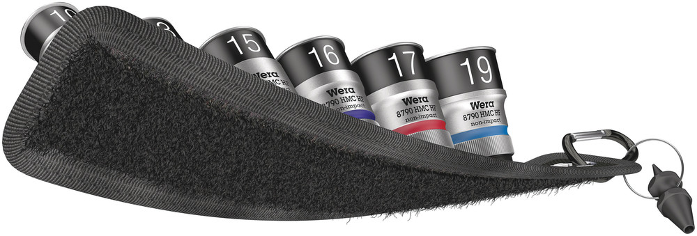 System oznaczenia kolorystycznego kluczy według rozmiaru „Take it easy“ ułatwiający i przyspieszający odnajdywanie właściwego narzędzia. Wraz z metalowym karabińczykiem umożliwiającym mocowanie do szlufki lub torby. Klucze nasadowe z funkcją przytrzymywania umożliwiające wyjątkowo komfortową pracę bez ryzyka zgubienia śruby podczas zbliżania narzędzia do detalu. Wykonany z włókniny spód zawieszki oraz rzepy ułatwiają mocowanie np. do ściany, półki, wózka warsztatowego i elementów systemu do transportu narzędzi Wera 2go.