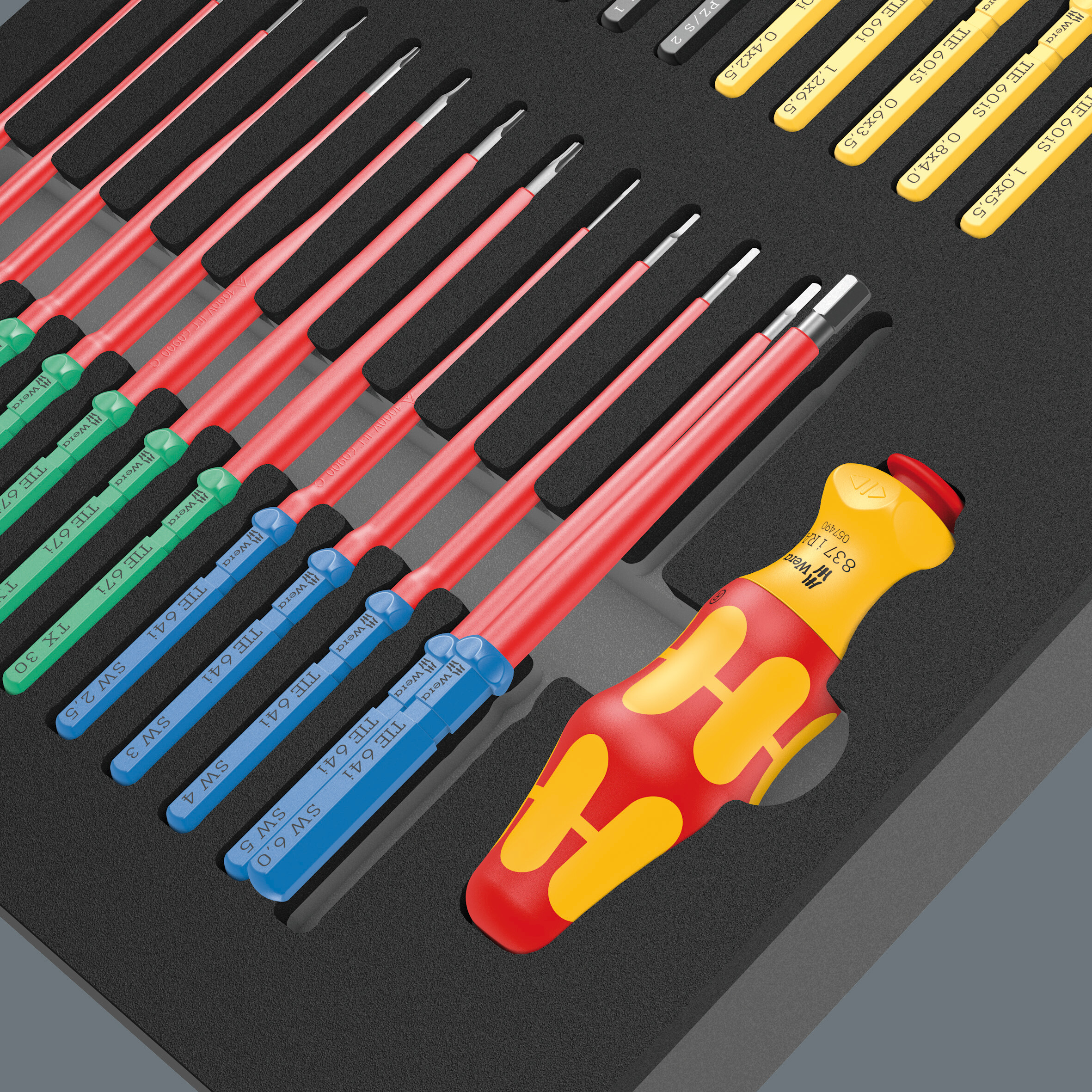 Wytrzymała wkładka piankowa; dwukolorowa ułatwiająca szybką identyfikację brakujących elementów; odpowiednia do wózka warsztatowego Tool Rebel. Z 1 rękojeścią 837 i RA z uchwytem na trzpienie wymienne Wera Kraftform Kompakt VDE; z grzechotką o drobnych zębach zintegrowaną w rękojeści (40 zębów/kąt powrotu zapadki 9°), 1 rękojeścią Kraftform 817 VDE z uchwytem na trzpienie wymienne Wera Kraftform Kompakt VDE, 26 trzpieniami wymiennymi Wera Kraftform Kompakt VDE z wyszukiwarką narzędzi Take it easy: z oznaczeniem kolorystycznym według profilu i laserowym oznaczeniem rozmiaru.