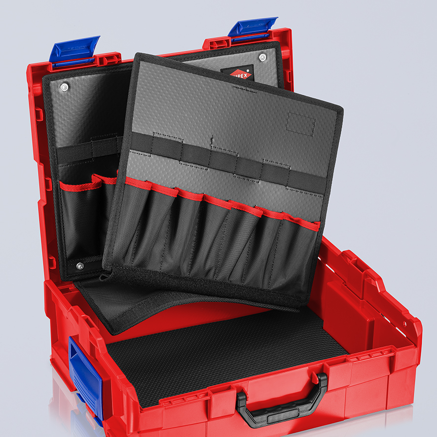 Dno walizki posiada w części górnej 7 kieszeni oraz zaczep umożliwiający zawieszenie wkładki; pozwala także na uniesienie lub postawienie walizki KNIPEX L-BOXX®