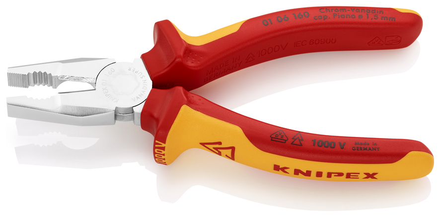 Strona główna » Narzędzia izolowane Knipex » Szczypce uniwersalne, chromowo-wanadowe » Knipex 01 06 160 Szczypce uniwersalne VDE kombinerki