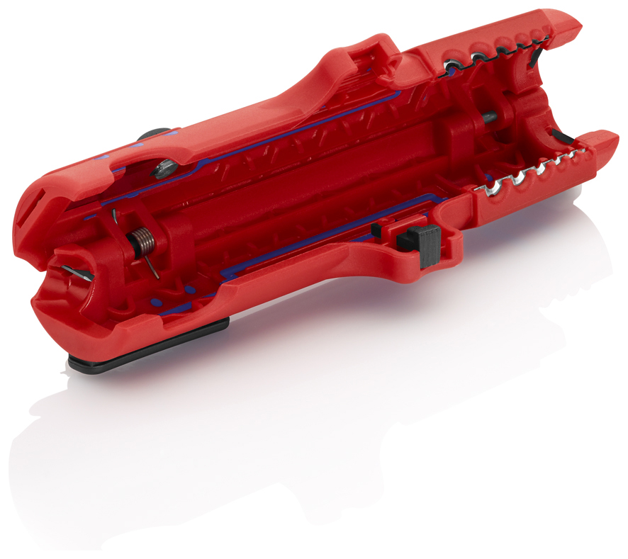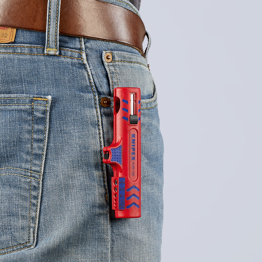 Uniwersalne narzędzie do ściągania izolacji Knipex 16 85 125 SB ma korpus wykonany z tworzywa sztucznego wzmacnianego włóknem szklanym. Przeznaczone do usuwania izolacji z wszystkich ogólnie stosowanych kabli okrągłych o średnicy od 8,0 do 13,0 mm (np. kabli NYM 3 x 1,5 mm² aż do 5 x 2,5 mm²). Konstrukcja to dwuczęściowy korpus z wysuwanym ostrzem, ze sprężyną rozwierającą, z blokadą otwarcia oraz zatrzaskiem mocującym pozwalającym na bezpieczne przechowywanie. Narzędzie nadaje się także do pracy w skrzynkach przyłączowych i rozdzielczych.