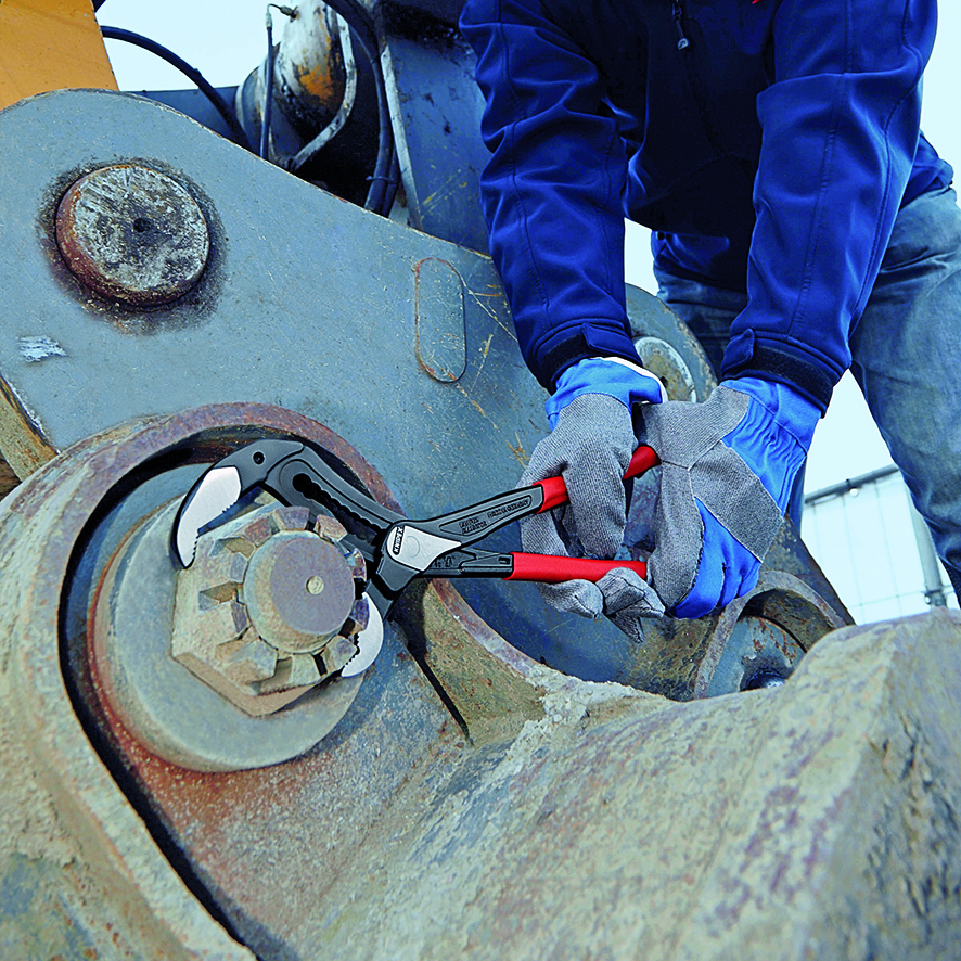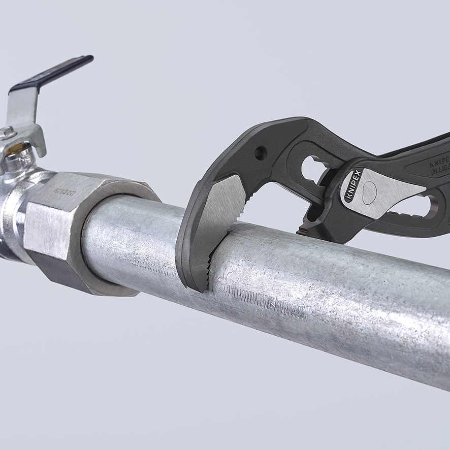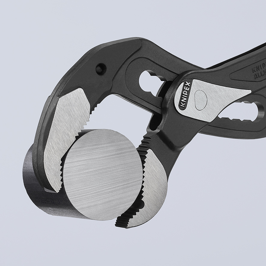 Szczypce KNIPEX Alligator® XL oferują wydajność i komfort właściwy szczypcom do rur przy jednoczesnym zmniejszeniu wagi o 50 % i zwiększeniu zakresu chwytu (3 ½“) w stosunku do porównywalnych kluczy do rur. Dzięki poręcznej długości 400 mm szczypce KNIPEX Alligator® XL zmieszczą się w walizce każdego instalatora.