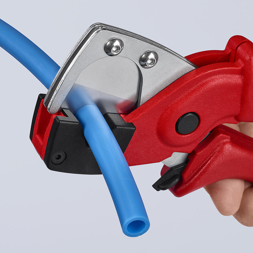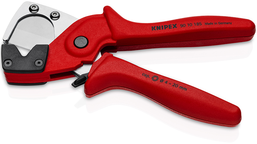 Obcinak Knipex 90 10 185 do rur wielowarstwowych i węży pneumatycznych został wykonany: rękojeści z tworzywa sztucznego wzmocnionego włóknem szklanym; noże ze specjalnej stali, hartowane olejowo i odpuszczane. Idealny do wszystkich węży/rur do cieczy, wielowarstwowych i pneumatycznych o średnicy 4–20 mm powszechnie dostępnych na rynku i przeznaczonych do szerokiego zakresu zastosowań.