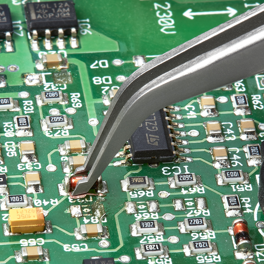 Do pracy z komponentami SMD (SMD=Surface mounted device): precyzyjna geometria pęsety SMD umożliwia również pracę z komponentami elektronicznymi, które można przylutować bezpośrednio do płytki drukowanej