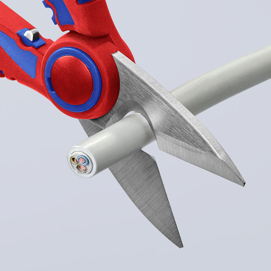 Nożyce dla elektryków Knipex 95 05 10 SB wykonane są: ostrza ze stali nierdzewnej, hartowane o twardości 56 HRC; rękojeści z wielokomponentowego tworzywa wzmacnianego włóknem szklanym. Nożyce mają uniwersalne zastosowanie, ostrza z funkcją nożyc do kabli, precyzyjne ostrza z drobnymi zębami zapewniają czyste cięcie i zapobiegają wyślizgiwaniu się podczas cięcia.