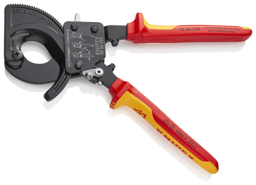 Strona główna » Nożyce do kabli i lin stalowych » Nożyce do kabli » Knipex 95 36 250 Nożyce do kabli z mechanizmem zapadkowym VDE