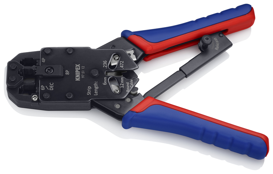 Do zagniatania telefonicznych wtyków 4-, 6- i 8-stykowych typu RJ 10 (o szerokości 7,65 mm), typu RJ 11/12 (o szerokości 9,65 mm) i typu RJ 45 (o szerokości 11,68 mm)
