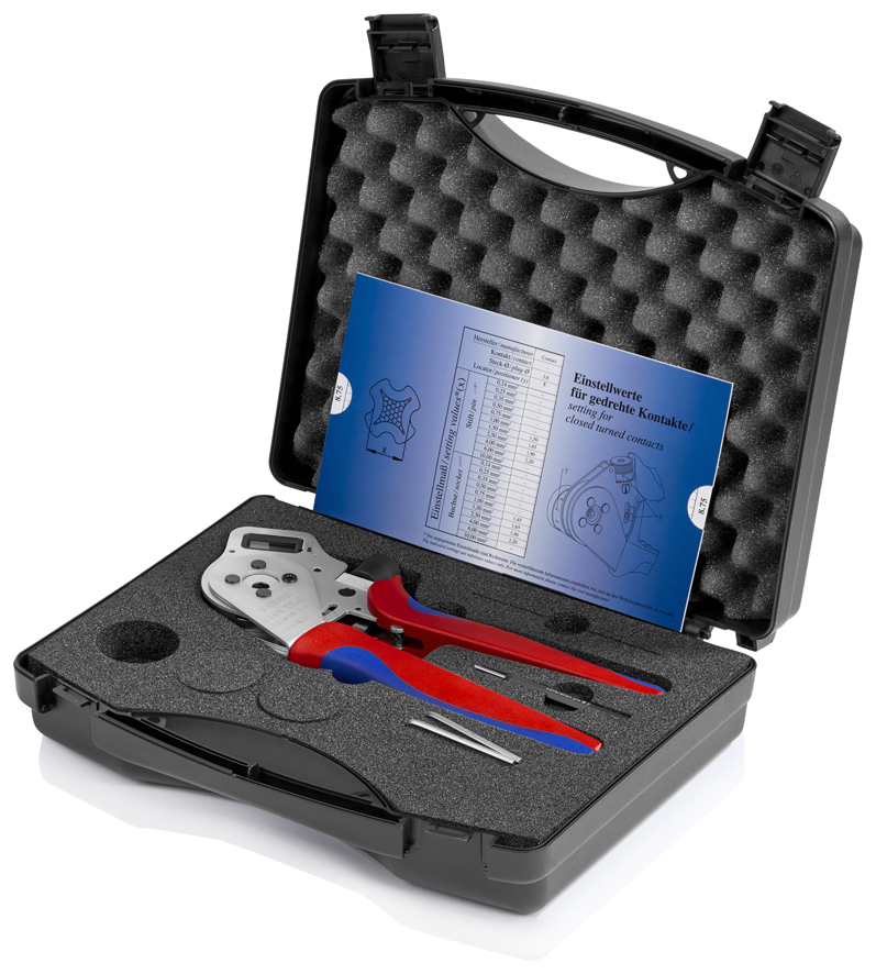 Szczypce w walizce z tworzywa sztucznego z wkładką piankową i pozycjonerem do precyzyjnego ustawienia zaciskanego styku