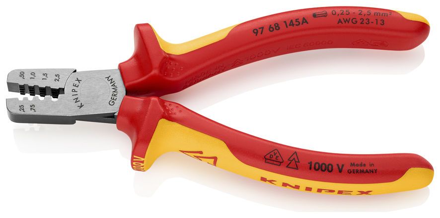 Strona główna » Narzędzia izolowane Knipex » Szczypce do zagniatania tulejek kablowych » Knipex 97 68 145 A Szczypce do zagniatania tulejek kablowych VDE