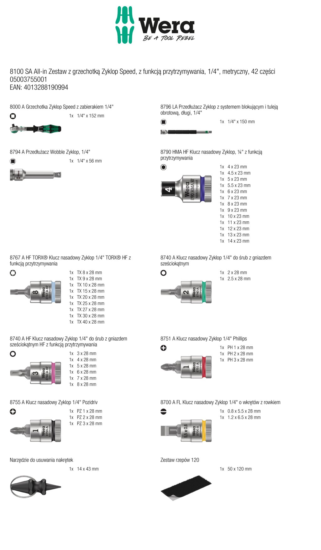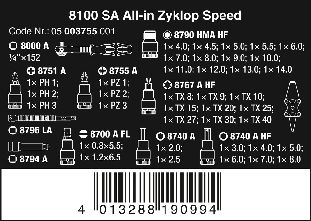 1 grzechotka Zyklop Speed z zabierakiem 1/4", 13 kluczy nasadowych Zyklop, zabierak 1/4", z funkcją przytrzymywania, 9 bitów nasadowych Zyklop 1/4", z funkcją przytrzymywania do śrub TORX® zgodnie ze specyfikacją Acument Intellectual Properties, 8 bitów nasadowych Zyklop 1/4" z funkcją przytrzymywania do śrub z gniazdem sześciokątnym, w rozmiarach 2,0 i 2,5 bez funkcji przytrzymywania, 3 klucze nasadowe Zyklop 1/4" do wkrętów z wgłębieniem krzyżowym Phillips, 3 klucze nasadowe Zyklop 1/4" do wkrętów z wgłębieniem krzyżowym Pozidriv, 3 klucze nasadowe Zyklop 1/4" do wkrętów z rowkiem. System wyszukiwania narzędzi „Take it easy“: z oznaczeniem kolorystycznym profili i rozmiarów umożliwiającym łatwe i szybkie odnajdywanie właściwych kluczy nasadowych. 1 narzędzie do łatwego usuwania nakrętek z kluczy nasadowych z funkcją przytrzymywania, 1 przedłużacz Zyklop (długi) z tuleją obrotową, 1 przedłużacz Wobble.
