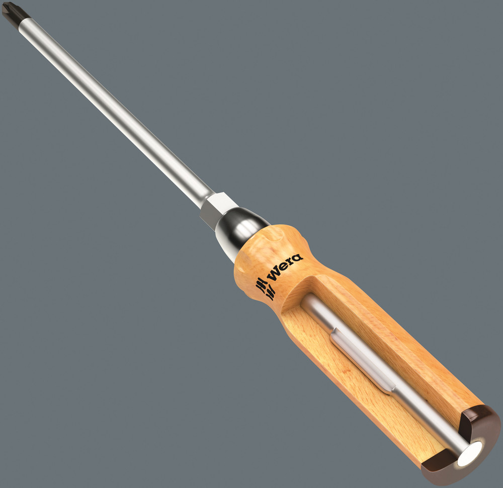 Wysokiej jakości wkrętak wykonany z twardego drewna bukowego gwarantującego długą żywotność nawet przy dużym obciążeniu. Podwójny skórzany kołpak w połączeniu z przelotowym trzpieniem zapewnia dodatkowe bezpieczeństwo podczas pobijania, ograniczając ryzyko rozszczepienia rękojeści. Sześciokątny zabierak spawany do trzpienia pozwala na wspomaganie kluczem płaskim lub oczkowym dla przenoszenia większych momentów obrotowych. Końcówka Black Point oraz specjalny proces hartowania zapewniają długi okres użytkowania, zwiększają odporność na korozję i gwarantują precyzyjne dopasowanie wkrętaka do gniazda wkrętu.