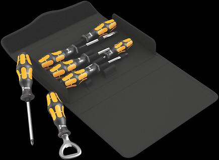 6-częściowy zestaw wkrętaków do dokręcania, pobijania, kucia i odkręcania mocno osadzonych śrub. Z wielokomponentową rękojeścią Kraftform do szybkiej i bezpiecznej pracy. Rękojeść Kraftform: twarde strefy chwytu umożliwiają szybką pracę, miękkie strefy zapewniają przenoszenie wysokich momentów obrotowych. Przelotowy trzpień z wysokiej jakości materiału używanego do produkcji bitów wkrętakowych pozwala na bezstratne przenoszenie siły nawet podczas pobijania. Ulepszony cieplnie materiał o dużej elastyczności zapobiega odpryskom lub pękaniu trzpienia. Nakładka do pobijania zwiększa trwałość i ogranicza ryzyko rozszczepienia rękojeści. Końcówka Black Point oraz specjalny proces hartowania zapewniają długi okres użytkowania, zwiększają odporność na korozję i gwarantują precyzyjne dopasowanie narzędzia do gniazda wkrętu. 6-kątny kołnierz zapobiega uciążliwemu staczaniu się narzędzia z miejsca pracy. Z kultowym otwieraczem do butelek Wera.