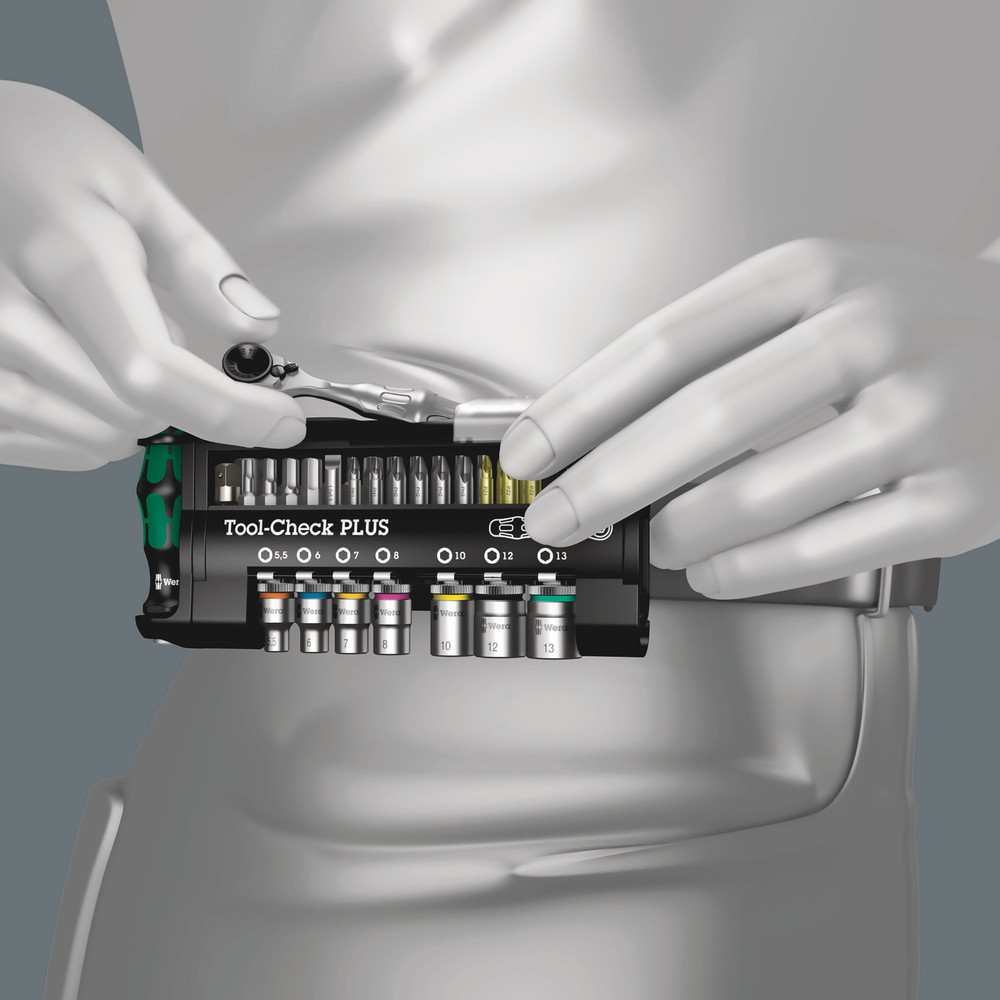 Grzechotka, groty i klucze nasadowe w niewielkim opakowaniu - bardziej kompaktowo już się nie da. Uchwyt do mocowania np. na pasku umożliwia mobilne zastosowanie zestawu Tool-Check. Z grzechotką do grotów: prosta obsługa nawet jedną ręką do prac w miejscach trudno dostępnych. Wykonana ze stali kutej matrycowo. Drobna podziałka z 60 zębami i małym kątem pracy wynoszącym 6° do prac precyzyjnych. Łatwe przełączanie kierunku prawo-lewo. Ergonomiczna konstrukcja główki i przełącznika. Do grotów 1/4". Z adapterem Wera 870/1 możliwe jest również obsługiwanie nasadek 1/4". Elastyczne groty, do uniwersalnego zastosowania. Klucz nasadowy (ISO 2725-część 3) do mocowania ręcznego oraz maszynowego. System oznaczenia kolorystycznego kluczy według rozmiaru "Take it easy" ułatwiający i przyspieszający odnajdywanie właściwego narzędzia. Poręczny kształt umożliwiający chwytanie nawet zabrudzonymi smarem rękami. Z zabezpieczającym pierścieniem wewnętrznym. Do śrub i nakrętek z łbem sześciokątnym. Ze stali chromowo-wanadowej, chromowany matowo.