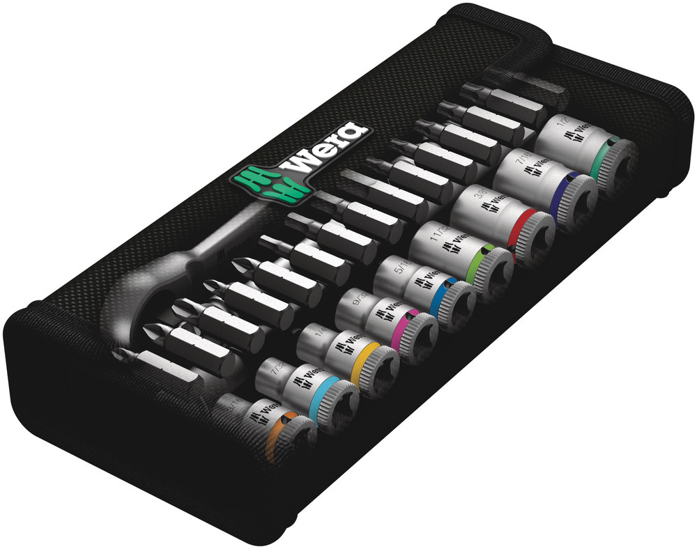 Niezwykle kompaktowe rozmieszczenie narzędzi na niewielkiej powierzchni. Zupełnie nowy zestaw w bardzo wytrzymałym i trwałym etui tekstylnym. Możliwość ustawienia w pozycji pionowej pozwalające na przejrzyste przechowywania na półce warsztatowej. Tkanina tekstylna na stronie zewnętrznej chroni powierzchnie narażone na zarysowania. Małe rozmiary i niewielka waga zapewniają dużą mobilność. Z systemem wyszukiwania narzędzi "Take it easy": oznaczenie kolorystyczne rozmiaru. 28-częściowy zestaw w solidnym, kompaktowym etui tekstylnym niepowodującym zarysowań powierzchni. 1 grzechotka Zyklop Metal z przekładanym zabierakiem 1/4", 9 kluczy nasadowych Zyklop, 1 przedłużacz Zyklop (długi) z tuleją obrotową, 1 przedłużacz Wobble, 1 adapter z mechanizmem szybkomocującym, 15 grotów.