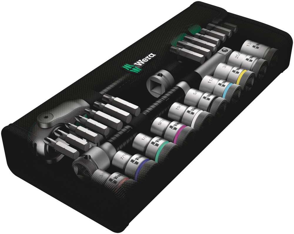 Niezwykle kompaktowe rozmieszczenie narzędzi na niewielkiej powierzchni. Zupełnie nowy zestaw w bardzo wytrzymałym i trwałym etui tekstylnym. Możliwość ustawienia w pozycji pionowej pozwalające na przejrzyste przechowywania na półce warsztatowej. Tkanina tekstylna na stronie zewnętrznej chroni powierzchnie narażone na zarysowania. Małe rozmiary i niewielka waga zapewniają dużą mobilność. Z systemem wyszukiwania narzędzi "Take it easy": oznaczenie kolorystyczne rozmiaru.