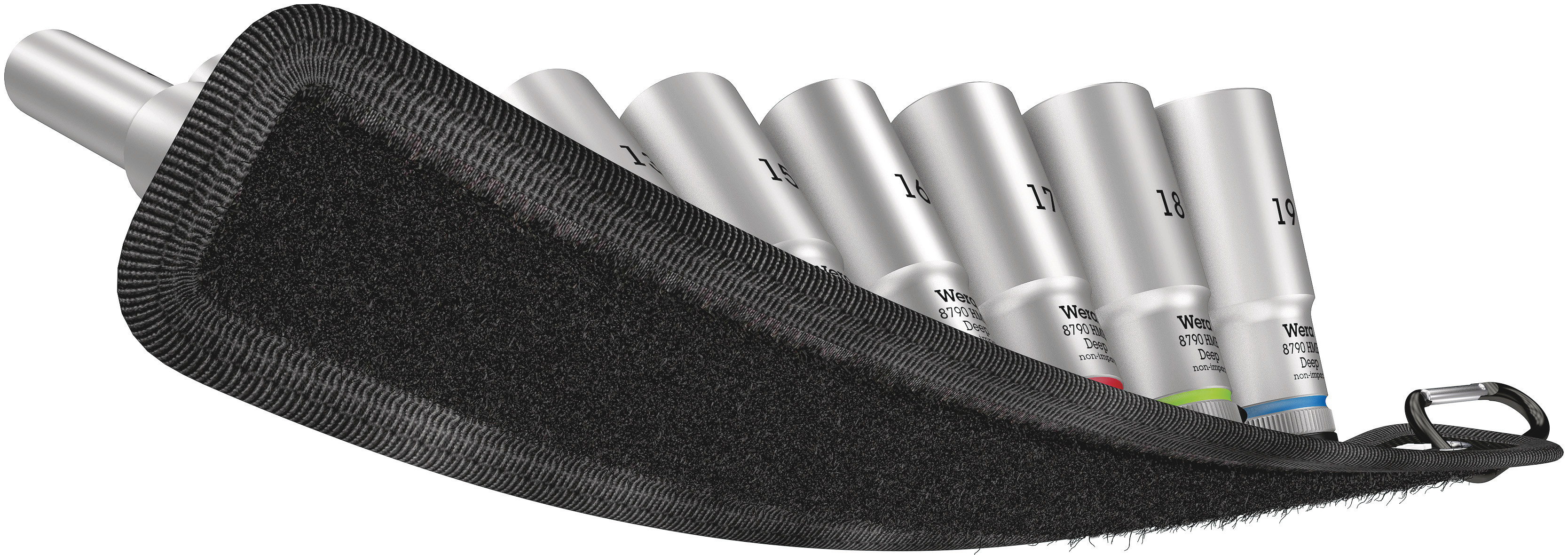 Wytrzymała zawieszka tekstylna wykonana w stylu charakterystycznym dla firmy Wera z 9 długimi końcówkami wymiennymi klucza nasadowego 3/8" do obsługi ręcznej i maszynowej w wąskich przestrzeniach. Płynnie działający mechanizm obrotowy dla pewnego mocowania i łatwego wyjmowania nasadek. Wraz z metalowym karabińczykiem umożliwiającym mocowanie do szlufki lub torby. Wykonany z włókniny spód zawieszki oraz rzepy ułatwiają mocowanie np. do ściany, półki, wózka warsztatowego i elementów systemu do transportu narzędzi Wera 2go. Długie końcówki wymienne klucza nasadowego 3/8" (ISO 2725 część 3) firmy Wera do obsługi ręcznej i maszynowej (non impact), także do głęboko położonych połączeń śrubowych i wystających prętów gwintowanych. Z systemem oznaczenia kolorystycznego kluczy według rozmiaru „Take it easy" ułatwiającym i przyspieszającym odnajdywanie właściwego narzędzia. Poręczny kształt umożliwiający chwytanie nawet zabrudzonymi smarem rękami. Z profilem sześciokątnym i rowkiem ustalacza kulkowego. Z profilem sześciokątnym. Profil sześciokątny umożliwia przenoszenie dużych sił, a ponadto obciąża krawędzie nakrętki lub łba śruby w mniejszym stopniu niż profil dwunastokrawędziowy. Drobno ząbkowana grzechotka dzięki niewielkiemu kątowi pracy sprawia, że stosowanie dwunastokrawędziowego profilu jest zbędne, nawet w wąskich przestrzeniach. Do śrub i nakrętek z łbem sześciokątnym.
